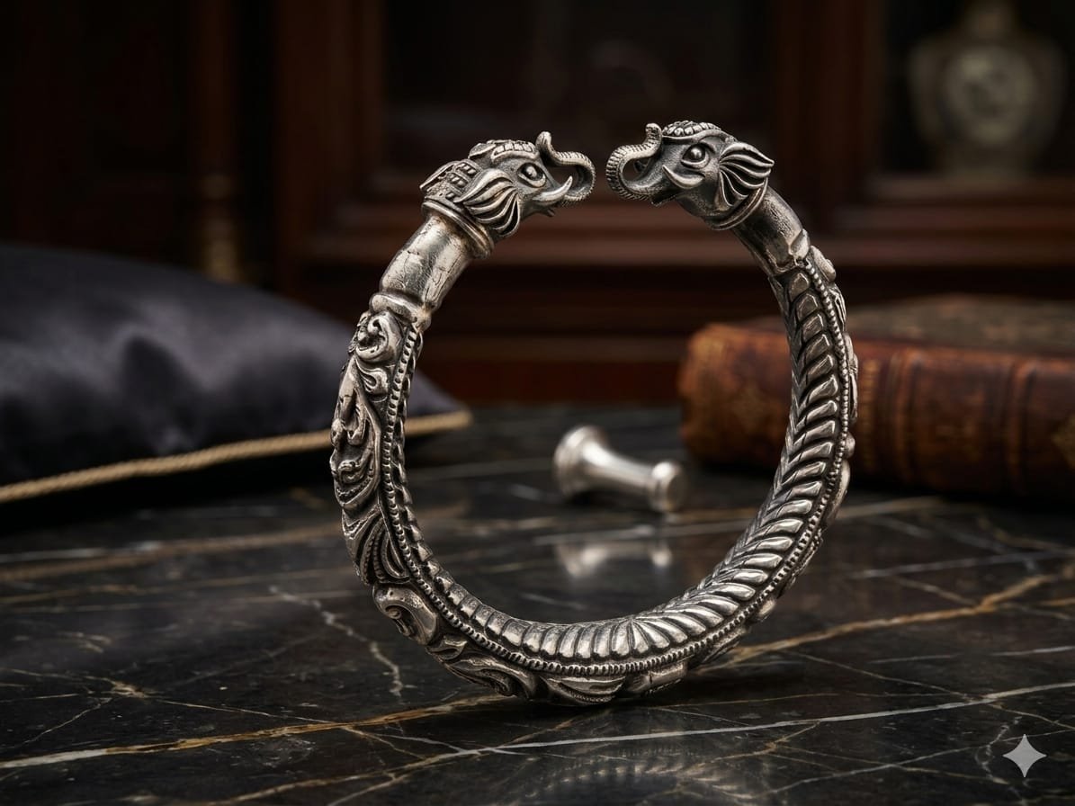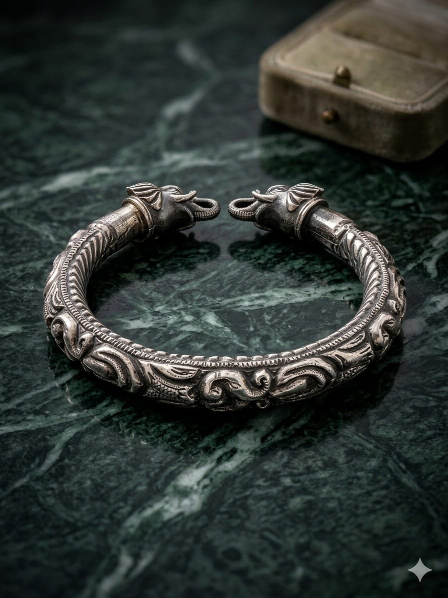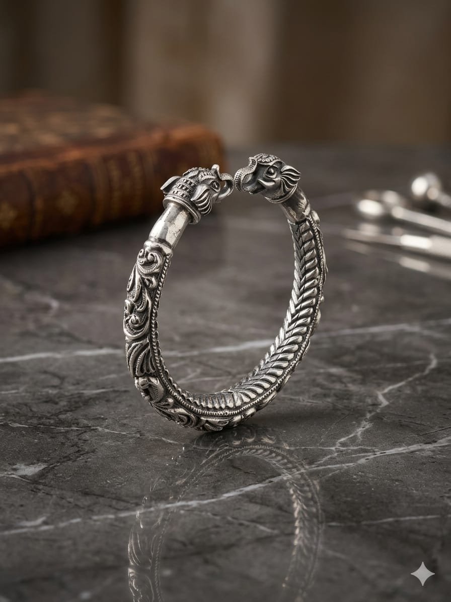 Design Motif: The centerpiece of the bracelet is the dual elephant head terminals. The elephants are depicted facing each other with their trunks slightly raised, a symbol often associated with strength, wisdom, and good fortune in various cultures.