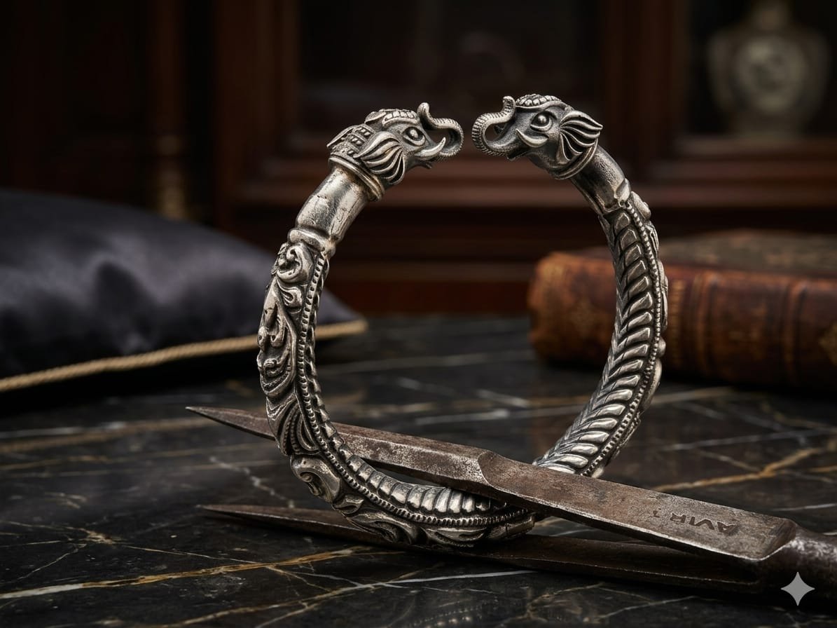The craftsmanship is reminiscent of traditional Indian or Southeast Asian jewelry design, specifically styles like Kada from Northern India or tribal silver work. It blends a bold, masculine silhouette with delicate, feminine floral details, making it a versatile statement piece.