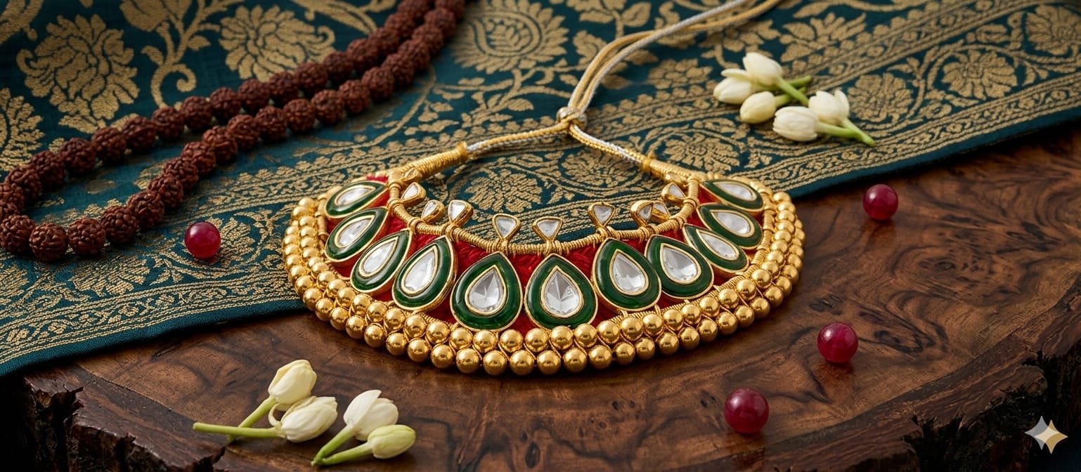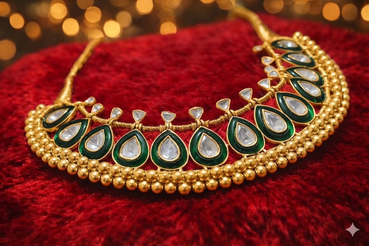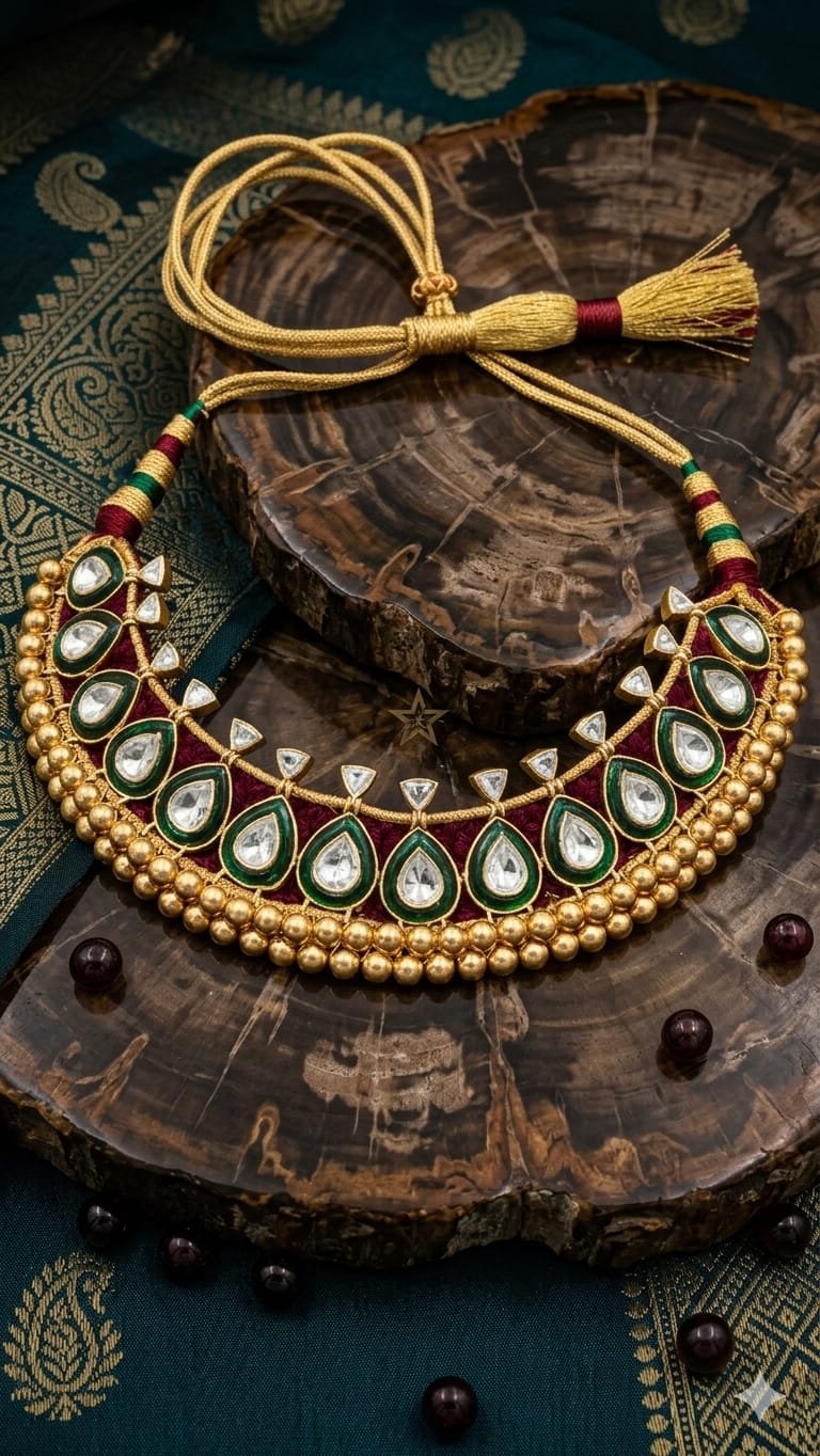 Color Palette: A classic combination of Gold, Emerald Green, and Deep Maroon, which is frequently seen in heritage bridal or festive jewelry.