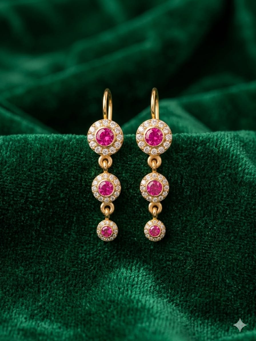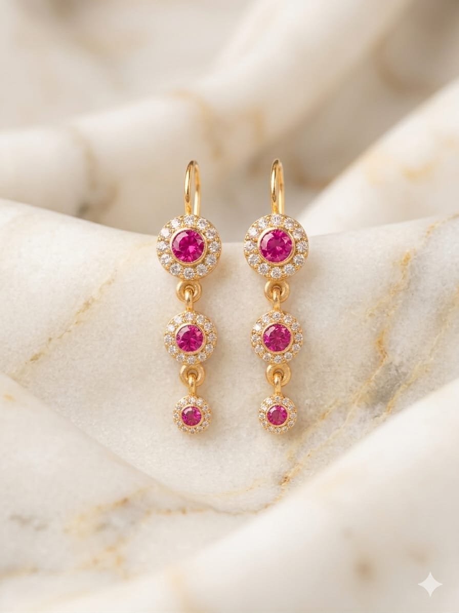 Gemstones: * Main Stones: Each tier features a round-cut, vivid magenta or ruby-pink stone at the center.