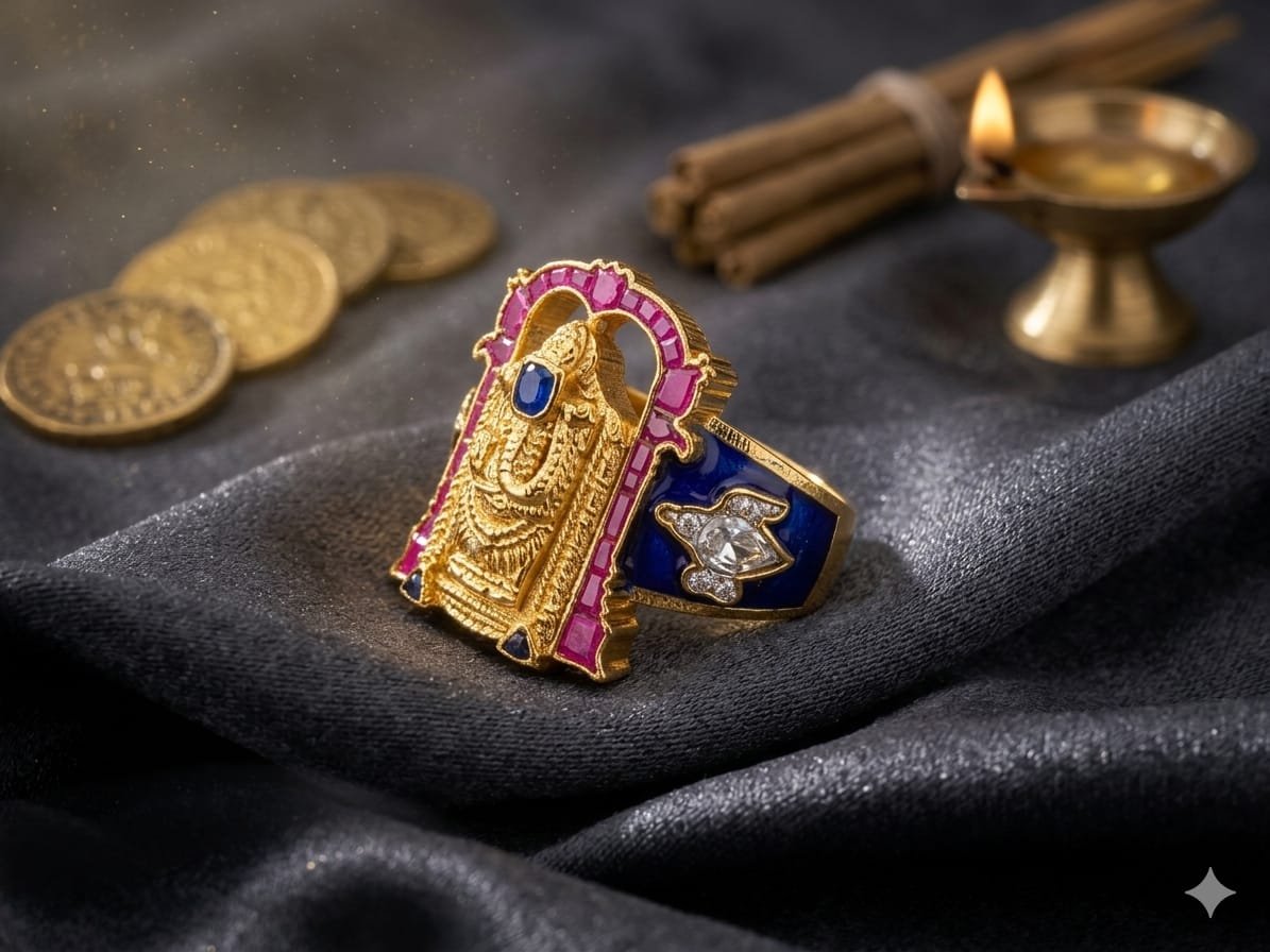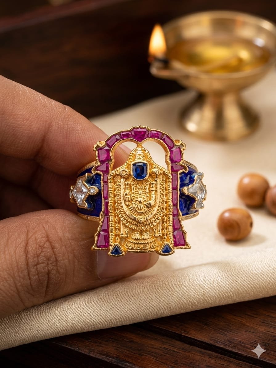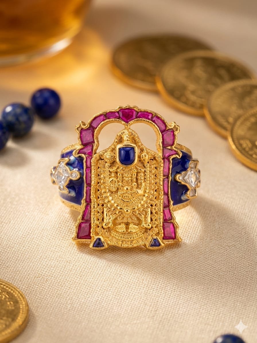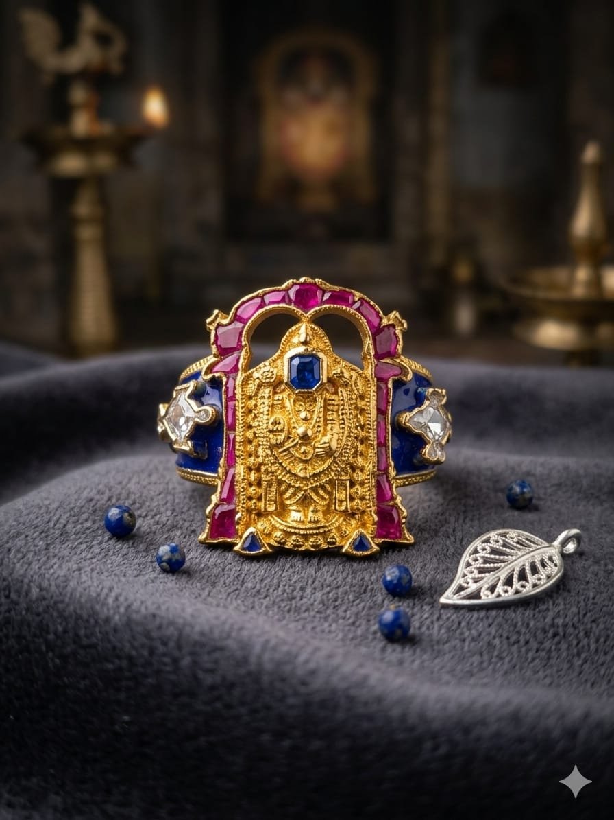 Central Figure: The centerpiece is a highly detailed gold carving of a deity, likely Lord Venkateswara (Balaji), identifiable by the distinct silhouette and the ornate “Prabhavali” (arch) surrounding the figure.