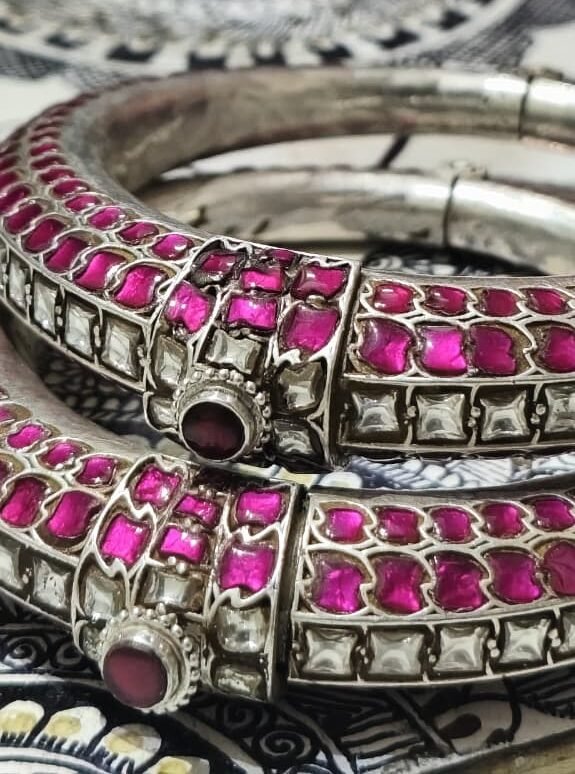 The design reflects Rajasthani heritage in its intricate motifs and patterns, honoring the region’s majestic artistry. The silver Kada’s sleek contours and tasteful use of ruby make it adaptable enough to pair with both traditional and contemporary outfits. Whether you’re drawn to antique-inspired styles or prefer minimalistic elegance, this accessory bridges the gap between classic and modern jewelry trends.
