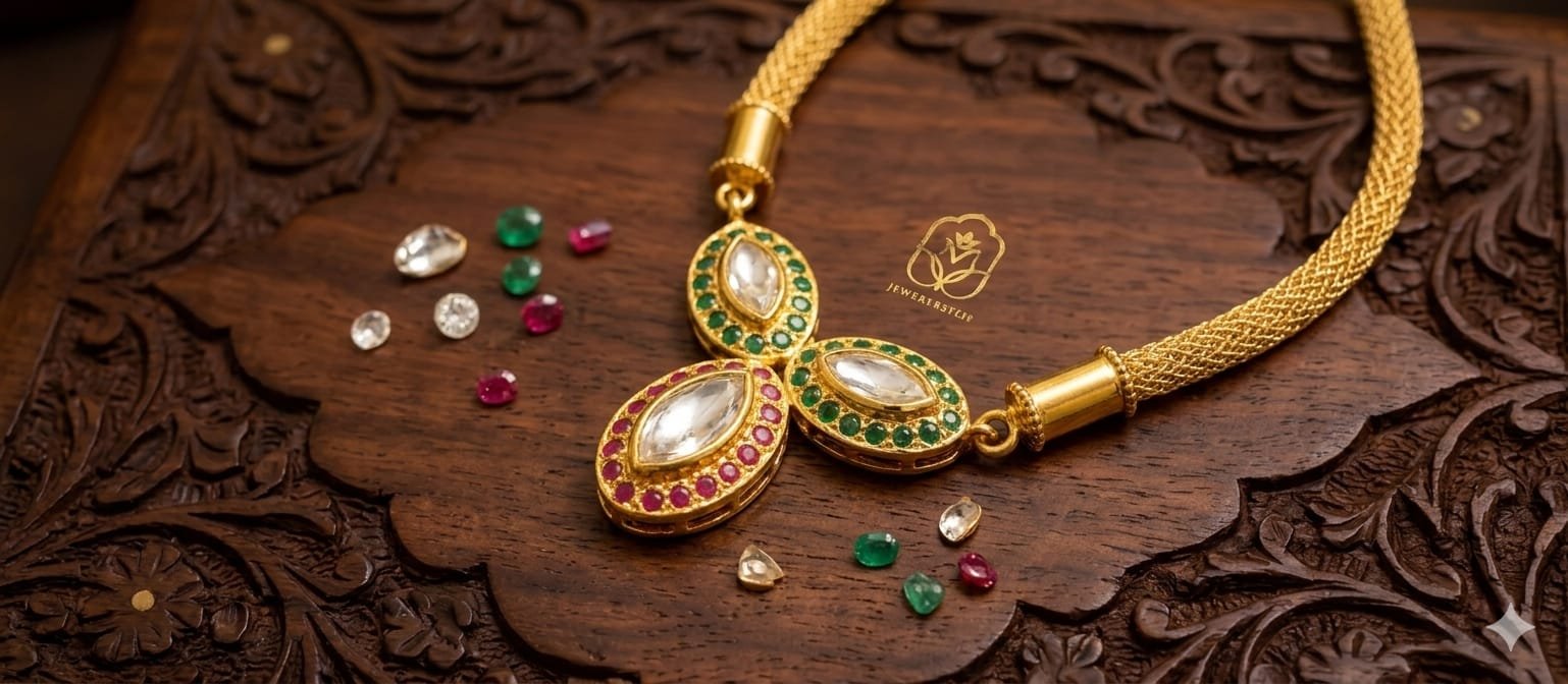 The Necklace: The central pendant is composed of three interconnected oval/marquise elements. The top two sections are accented with green stones, while the larger bottom drop is framed in pink stones. The “CZ chain” attaches to the gold-toned cylindrical terminals at the top.