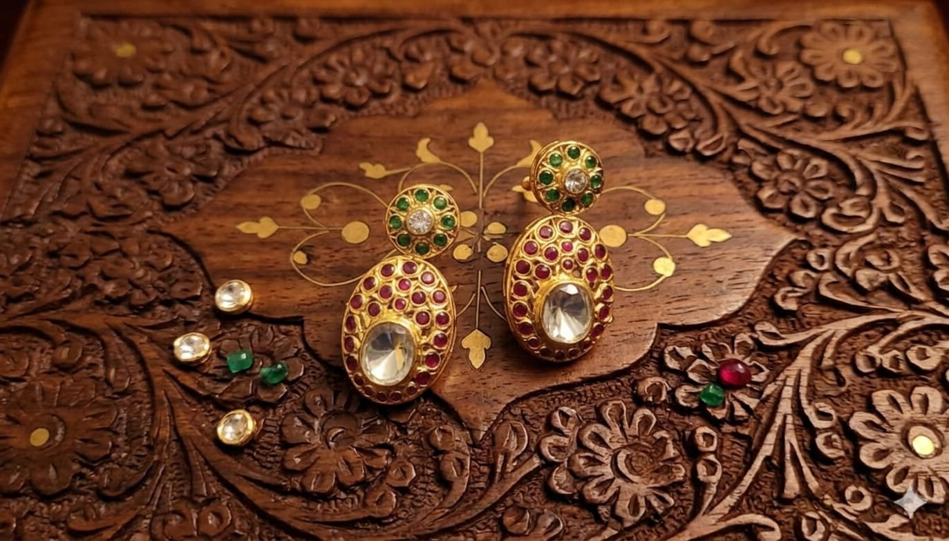 The Earrings: These are matching tops or small danglers. They feature a circular stud encrusted with green stones and a larger oval drop that mirrors the design of the necklace’s main pendant.