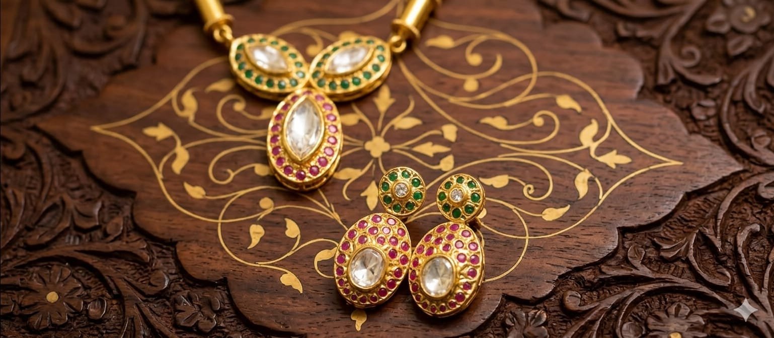 Metalwork: The pieces are set in a yellow-gold finish with a heavy, textured “ghat” (frame) typical of temple or heritage jewelry.